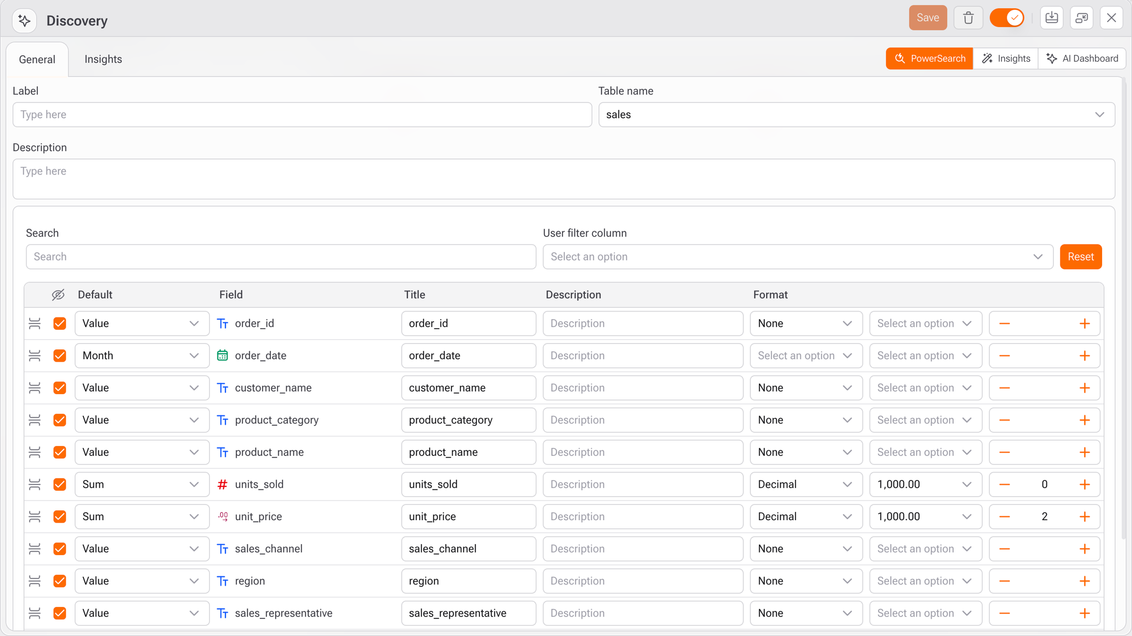 • User filter column (opcional): Campo para aplicar filtros automáticos com base no usuário logado (ex.: region ou sales_rep)