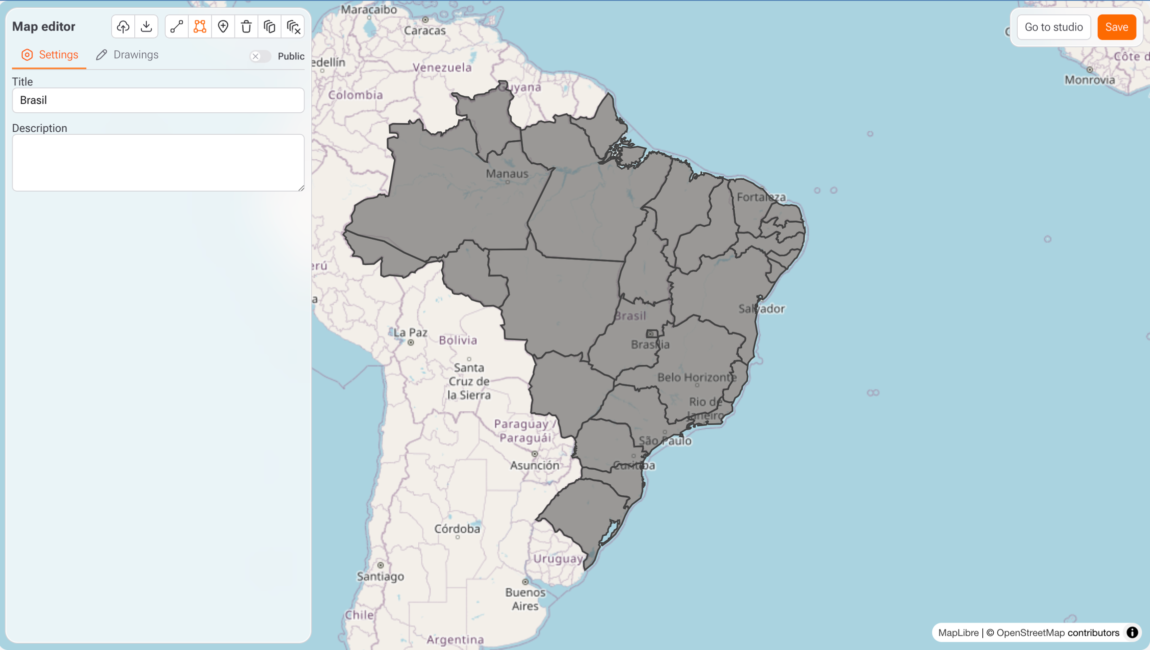 O editor utiliza o MapLibre, baseado no OpenStreetMap.