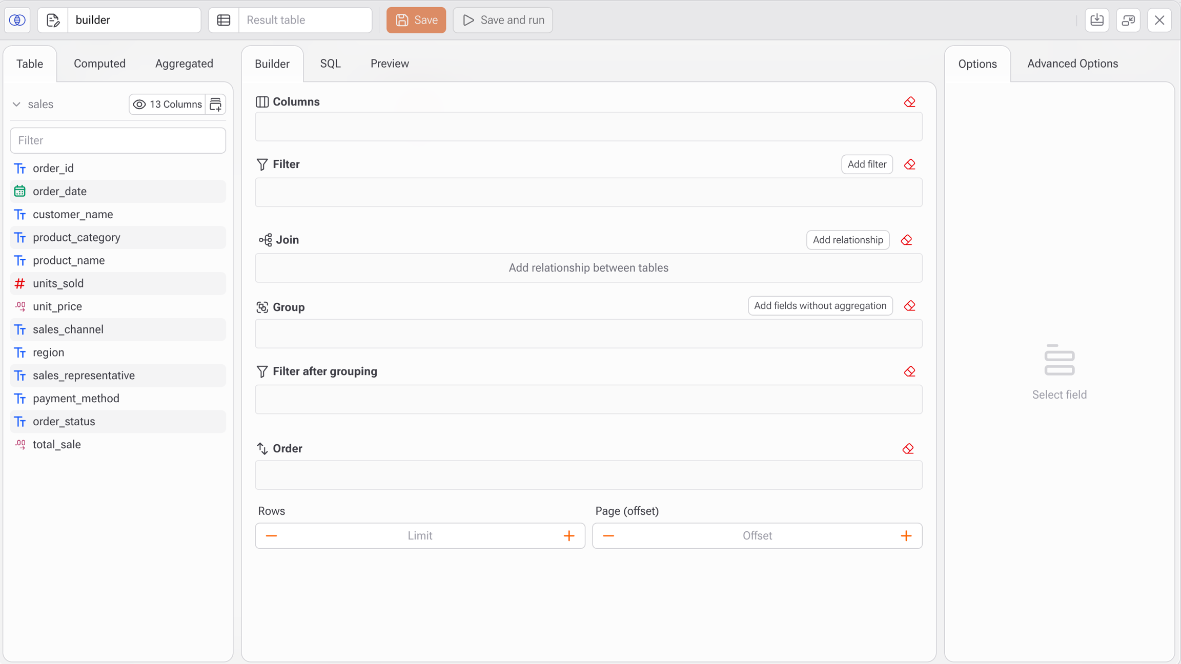 • Tabela: A tabela deve ser vinculada automaticamente a partir do bloco selecionado (e.g., new_sales).