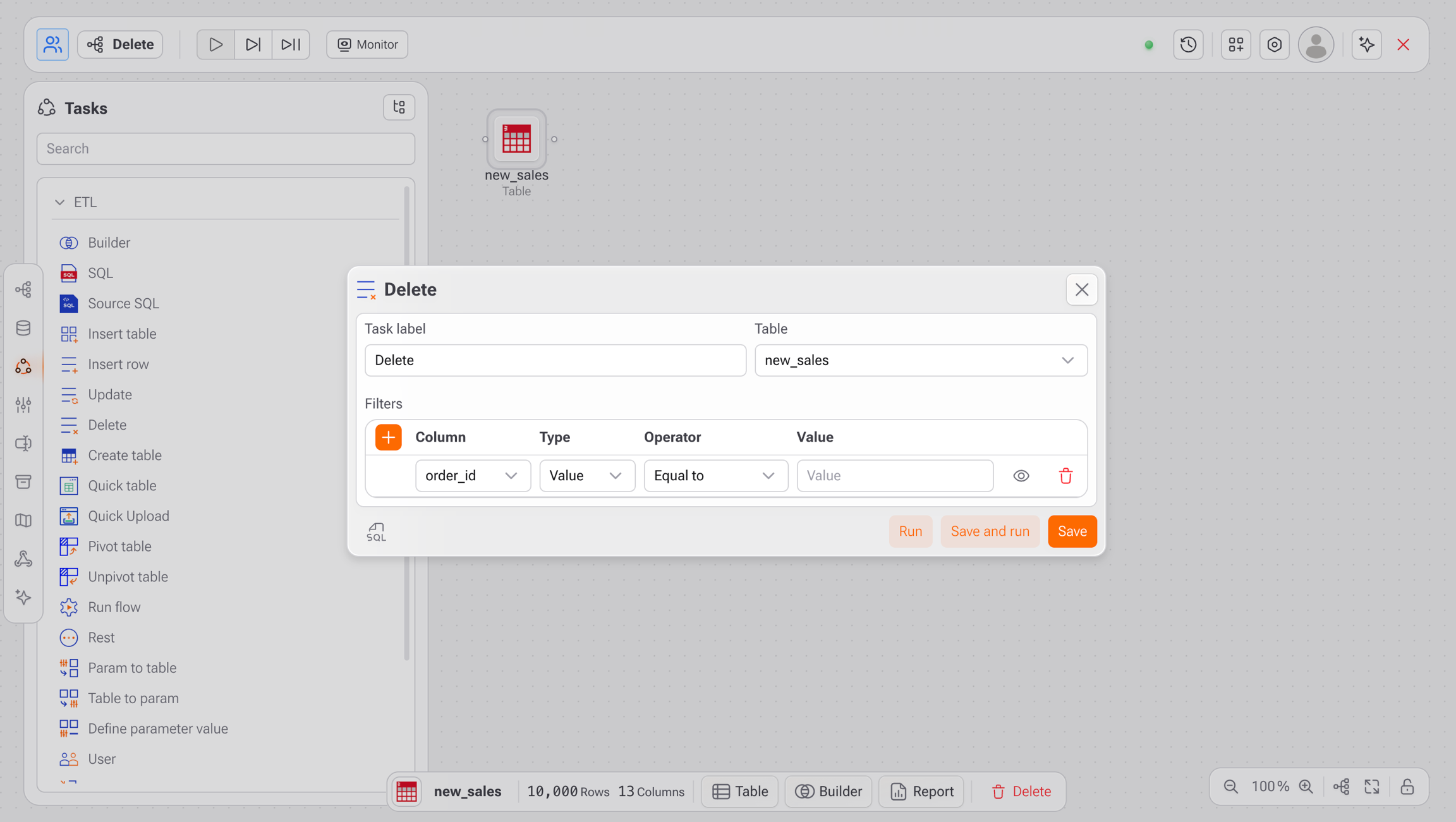 Esta task só pode ser utilizada quando uma tabela estiver selecionada no fluxo. Certifique-se de adicionar e conectar uma Table antes de configurar a exclusão.
