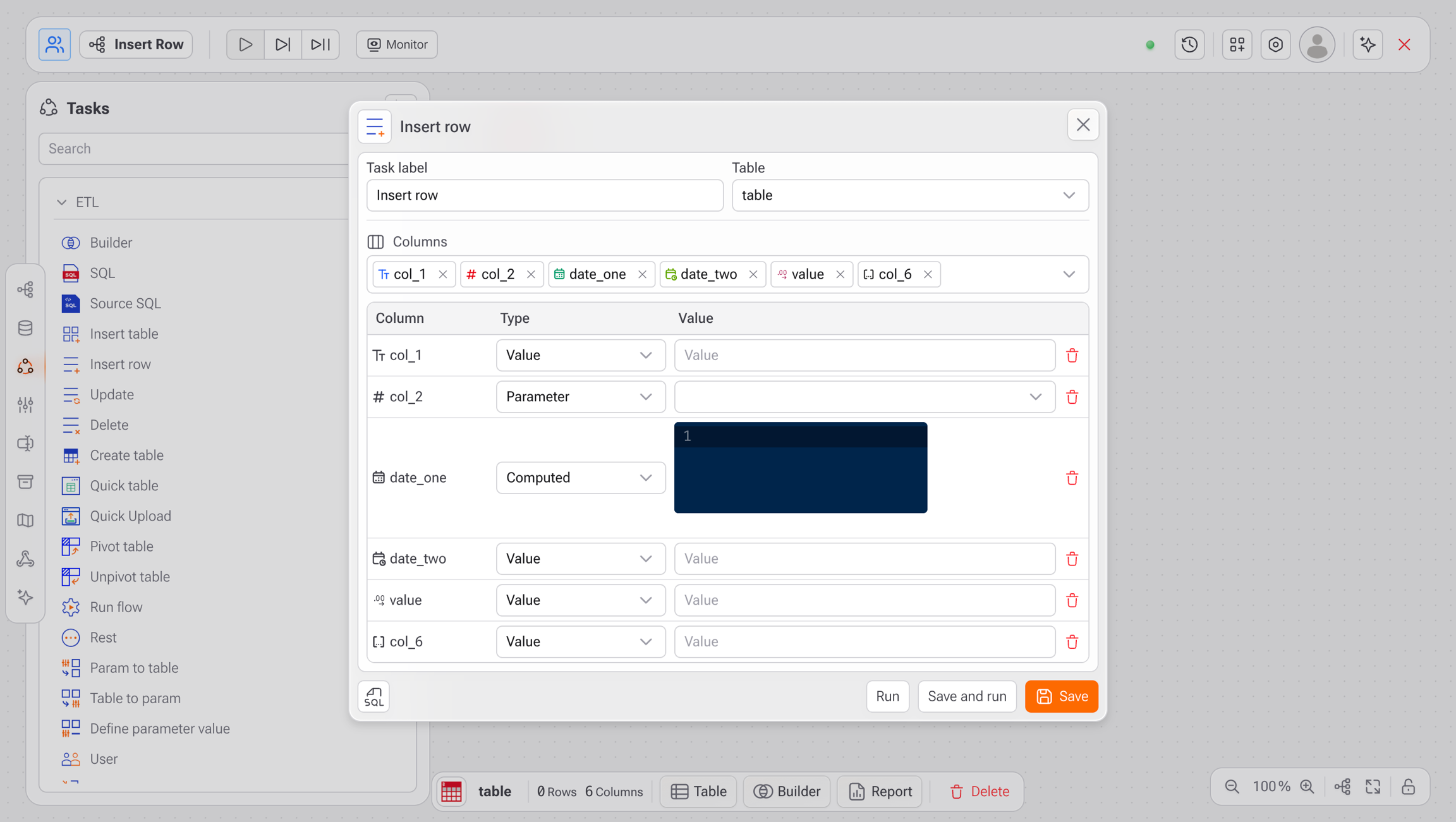 col_1: Type = Value, Value ="Novo Cliente"col_2: Type = Parameter, Value =@client_iddate_one: Type = Computed, Value =today()