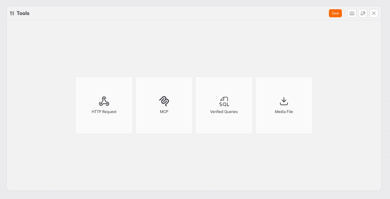 Las Herramientas definen qué acciones puede realizar un agente más allá de la conversación. Amplían sus capacidades permitiendo integraciones, acceso seguro a datos, consultas controladas y manejo de archivos multimedia.Un agente solo puede utilizar herramientas que hayan sido explícitamente creadas y asignadas, garantizando seguridad, previsibilidad y gobernanza. En la pantalla de Herramientas puedes crear y gestionar distintos tipos.