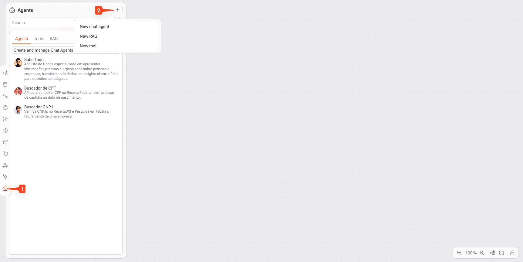 • Una barra lateral izquierda con la lista de todos los agentes creados