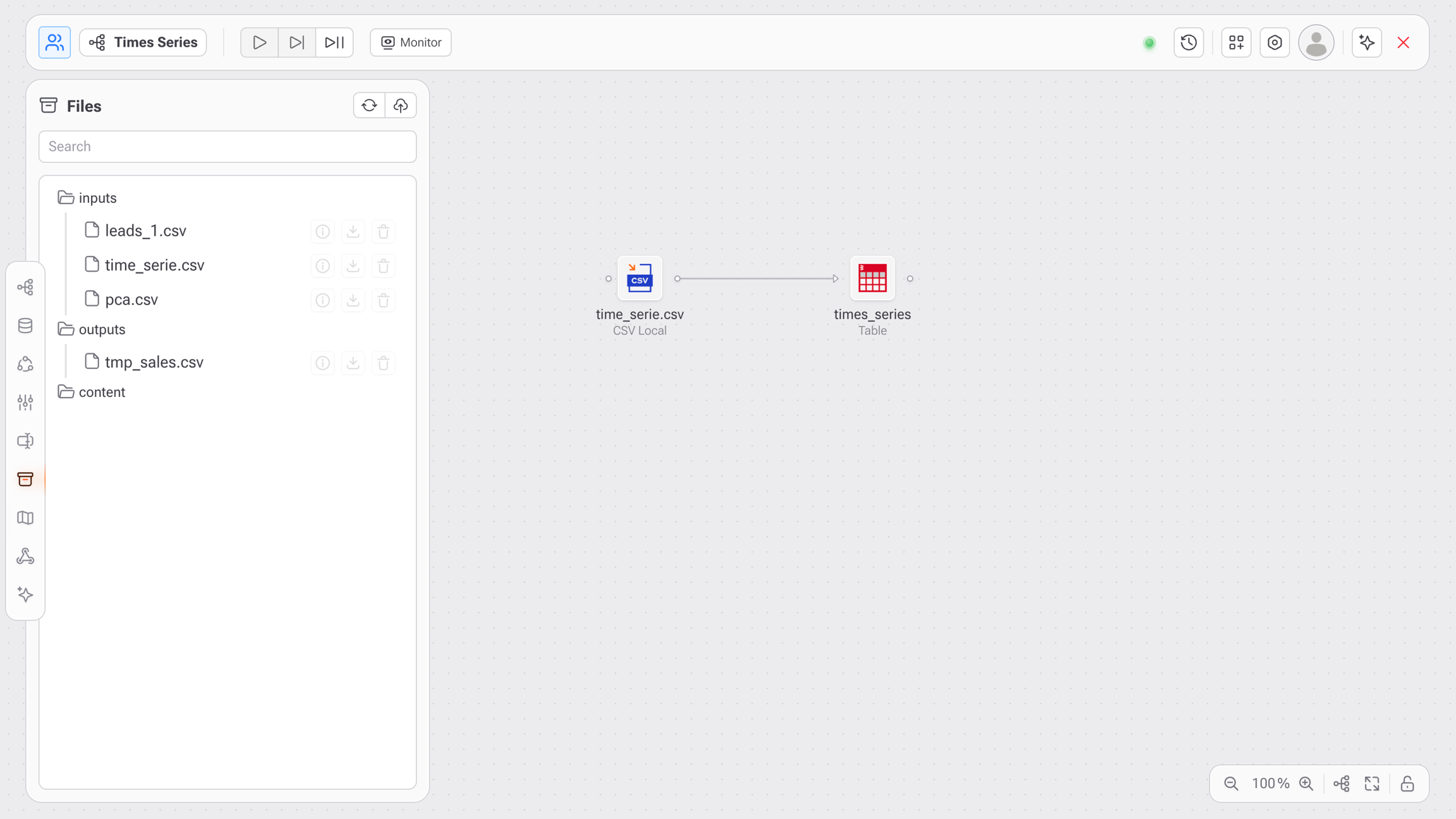 Después de cargar un archivo, puedes arrastrar un archivo CSV al lienzo del flujo.