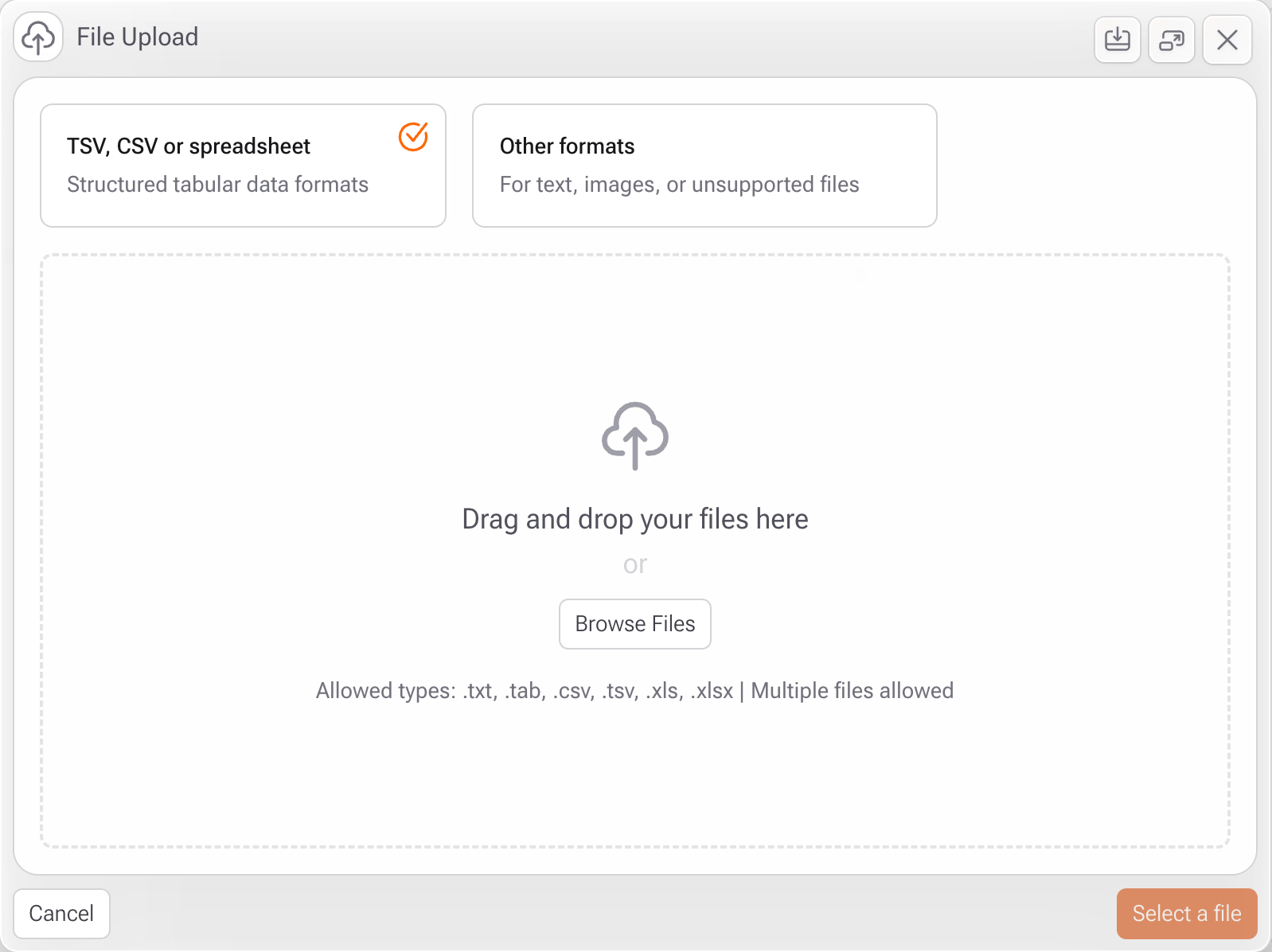 El panel de Archivos en Gaio DataOS permite a los usuarios cargar, organizar y utilizar archivos locales directamente dentro de los flujos de datos. Es ideal para trabajar con archivos tabulares (.csv, .xlsx, etc.) para análisis rápidos, pruebas de algoritmos o incluso procesos de datos recurrentes.