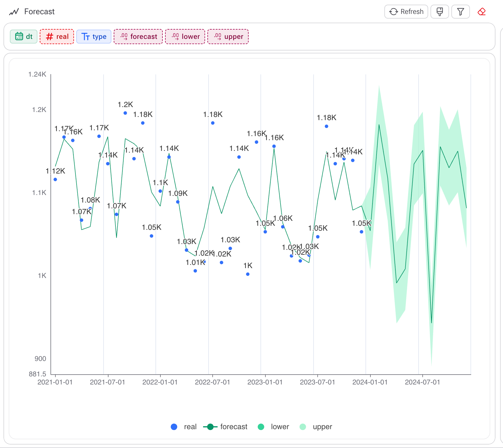 Para crear un gráfico cuando solo se proyectó una serie (sin una columna en Clasificación), ve a Report, arrastra todos los campos excepto la categoría y ordénalos en orden ascendente por la columna dt, que representa la fecha. Luego selecciona el gráfico de tipo Forecast.