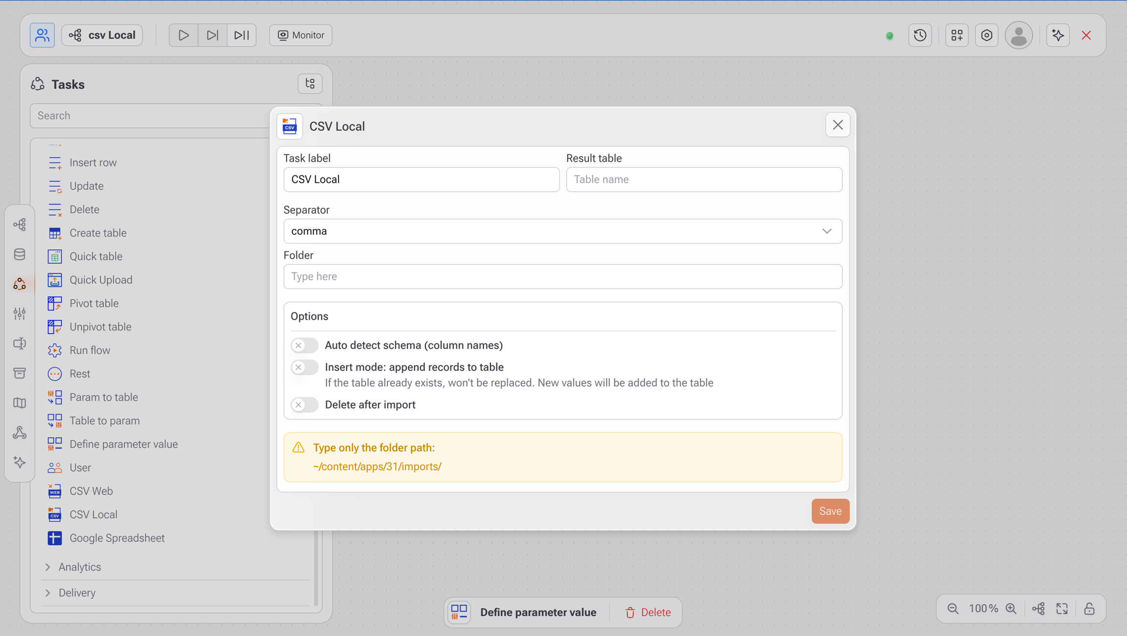 La tarea CSV Local en Gaio DataOS permite importar automáticamente archivos CSV que han sido cargados en un directorio local dentro del entorno de la plataforma. Es ideal para procesar archivos de entrada entregados manualmente o mediante integraciones con sistemas externos que depositan archivos en carpetas internas para su procesamiento.
